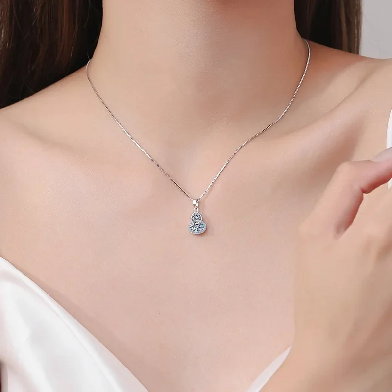 The pendant features a stylish gourd shape, a symbol of good fortune, harmony, and longevity. This meaningful design pairs perfectly with the brilliance of Moissanite, creating a necklace that’s not only fashionable but also symbolic—ideal for weddings, parties, anniversaries, and romantic celebrations.