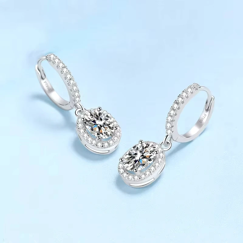 Expertly crafted from luxurious PT950 platinum, these earrings are polished to perfection for a lasting shine. The elegant drop design creates graceful movement and adds a touch of refinement to any look. Each earring features a 1CT or 2CT Moissanite diamond, secured in a classic setting to maximize light reflection and brilliance. Weighing about 3.7g, they offer a balanced blend of comfort and luxury for all-day wear.