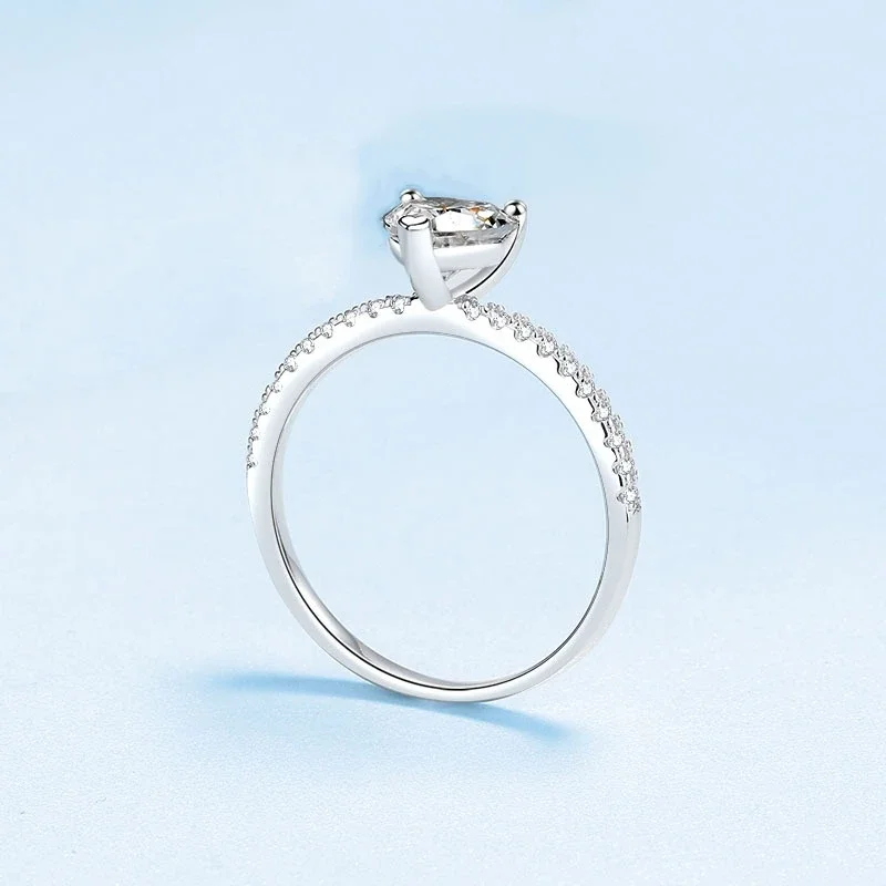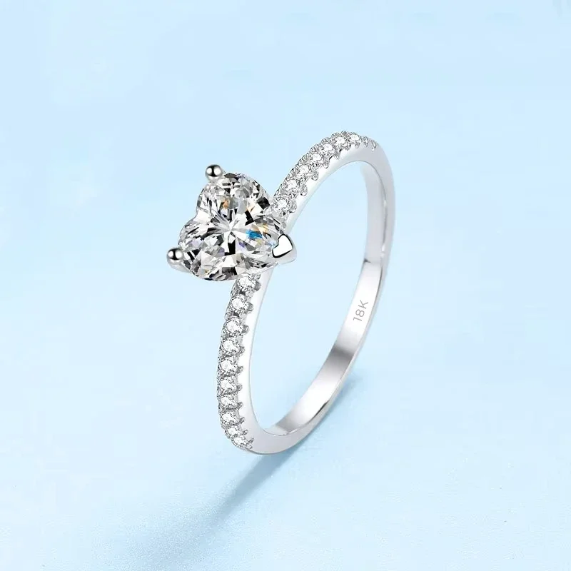 Made from PT950 platinum with an 18K white gold finish, this ring offers durability and radiant shine. At its center rests a heart-shaped Moissanite diamond, available in 1CT or 2CT sizes, delicately set in a classic prong setting to maximize brilliance and fire. Weighing about 1.8g, the ring feels lightweight yet luxurious, ideal for everyday wear or special occasions.