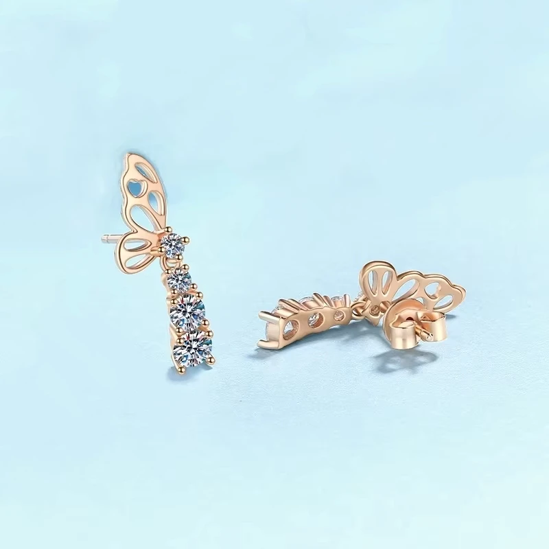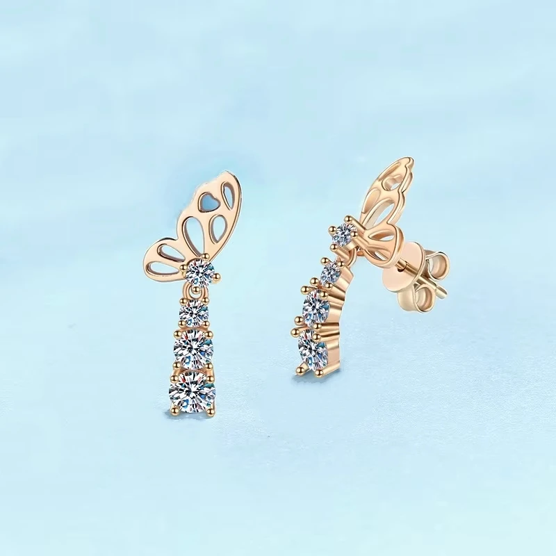 With their feminine rose gold setting, dazzling Moissanite brilliance, and unique butterfly design, these earrings are the perfect accessory for celebrating love and life’s special moments.