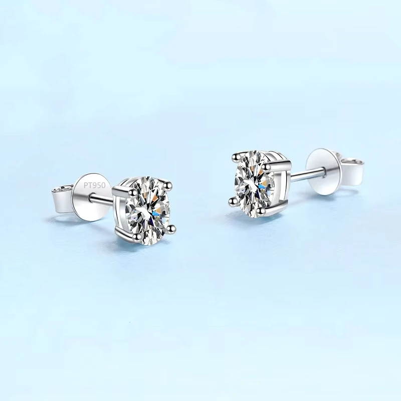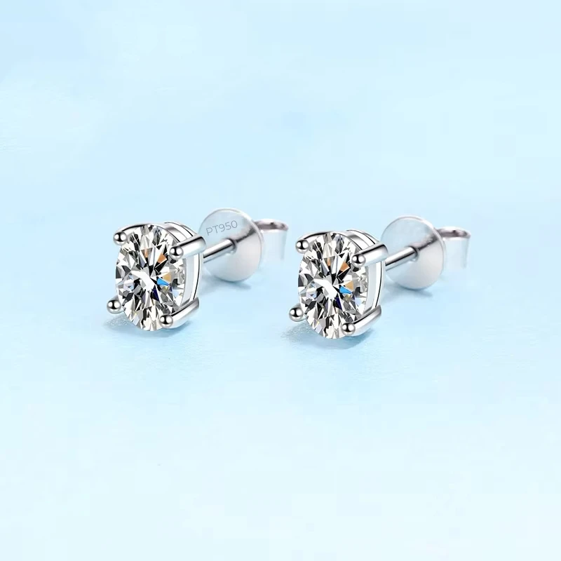 Expertly crafted from premium PT950 platinum, these earrings combine lasting durability with refined luxury. Their oval cut design offers a distinctive twist on the classic stud style, highlighting the brilliance of the Moissanite diamond while adding sophistication to any look. Weighing approximately 1.5g to 2.7g depending on size, they provide a comfortable yet secure fit for daily wear or special occasions.