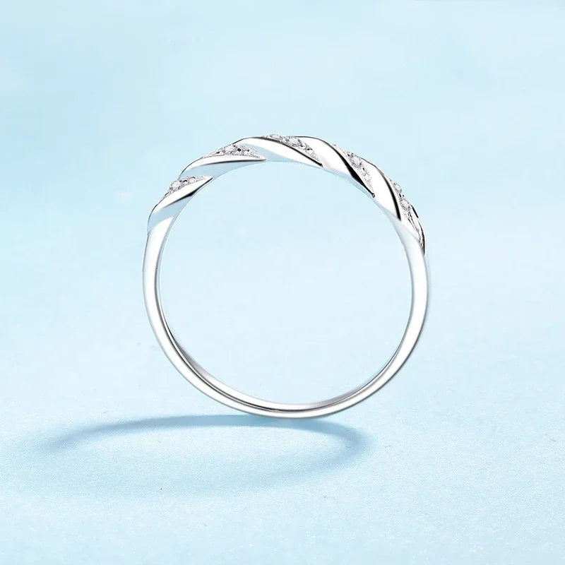 This ring features a 0.12 carat Moissanite diamond in a sleek channel setting, offering a subtle sparkle that symbolizes elegance and grace. Its minimalist design ensures it pairs beautifully with other rings or stands alone as a refined everyday piece.