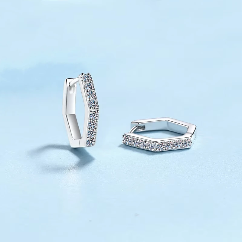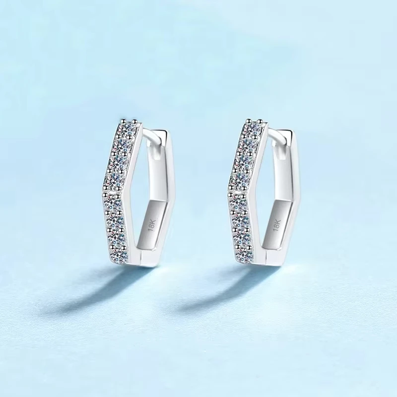 Made from PT950 platinum with an 18K white gold finish, these hoop earrings combine durability with refined luxury. The hexagonal geometric shape sets them apart from classic hoops, offering a bold yet sophisticated design. Each earring features a sparkling 0.4-carat Moissanite diamond, delicately set to maximize brilliance and fire. Weighing only 2.8g, they are lightweight and comfortable for all-day elegance.