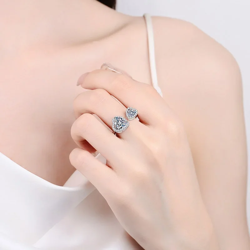What sets this ring apart is its unique double heart motif, symbolizing two souls joined together in love. Enhanced by a classic prong setting, the design not only secures the Moissanite but also allows maximum light reflection for extraordinary brilliance. This romantic detail makes it a meaningful piece of fine jewelry that will always remind her of your devotion.