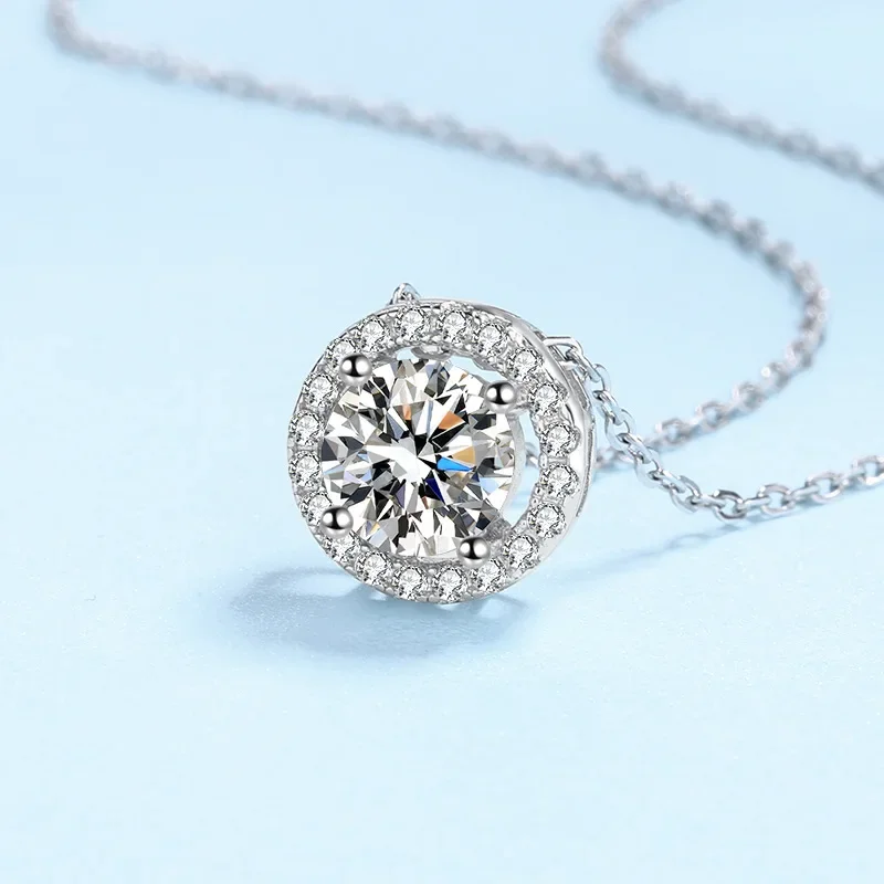 Featuring a brilliant round-cut Moissanite diamond, available in 0.5CT, 1CT, or 2CT, this necklace is a versatile expression of love and luxury. The minimalist pendant design makes it perfect for daily wear while still dazzling enough for formal occasions.